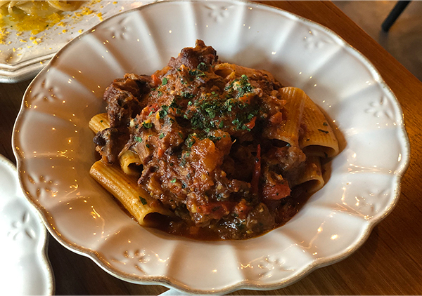 쉐프가 가장 애착을 갖고 있는 메뉴인 `소꼬리 라구 리가토니’는 시어링한 소꼬리를 갖가지 재료와 토마토 소스, 다양한 허브가 어우러진 부케 가르니를 넣고 10시간 이상 푹 끓여낸 라구 소스를 곁들인 파스타 메뉴다.