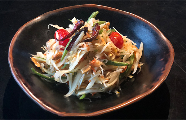 대표 메뉴인 `그린 파파야 샐러드’는 `쏨땀’으로 잘 알려진 태국식 샐러드로 그린 파파야를 주 재료로 하며 타이 고추의 매콤함과 건새우의 감칠맛, 신선한 생 라임 주스와 팜 슈거, 피쉬 소스 등의 재료를 결합하여 태국을 대표하는 맛인 시고, 맵고, 달콤한 모든 풍미를 낸다.