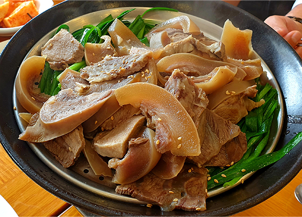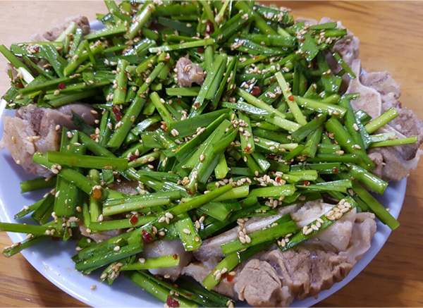 야들야들하게 삶아낸 소꼬리 수육 위에 푸짐하게 올라간 부추, 새콤달콤한 간장 소스의 조합으로 비주얼과 맛을 모두 충족시킨다.