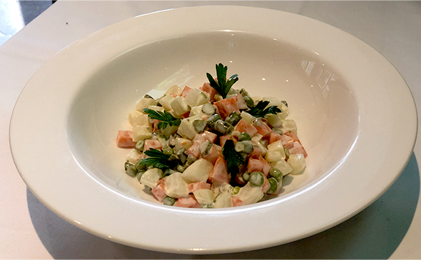 무, 당근, 완두콩, 감자 등 잘게 자른 채소와 마요네즈를 베이스로 한 샐러드.
