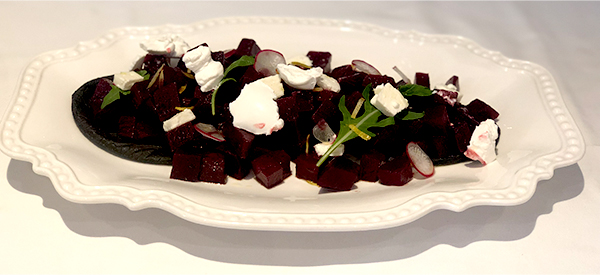 익힌 비트에 셰브르 치즈라 불리는 염소젖 치즈, 레디쉬를 심플하게 올려 낸 샐러드.