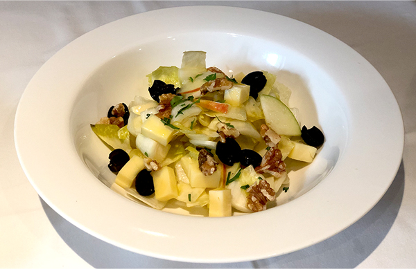 아삭한 식감의 프랑스 잎채소 샐러드의 대표적인 재료 엔다이브와 감자, 호두, 블랙올리브, 사과와 함께 버무린 샐러드.