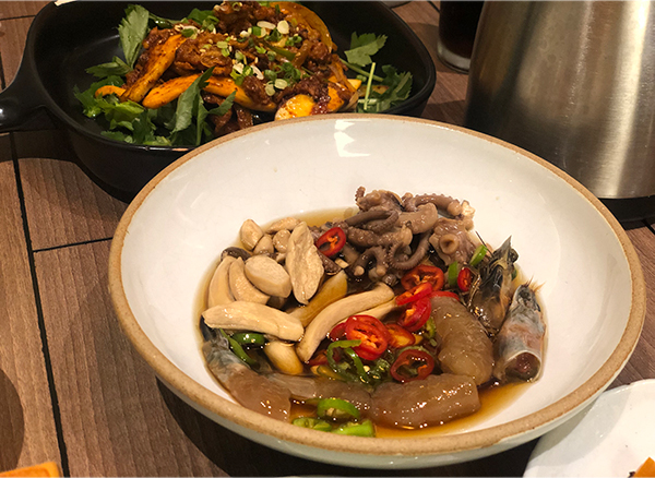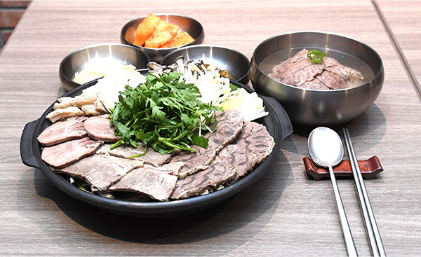`맑은 곰탕 전골’은 북한식 전골인 어복쟁반을 재해석한 메뉴다. 보기만 해도 넉넉한 크기의 전골냄비 속에는 양과 우설 등 다양한 부위의 수육과 국물의 감칠맛을 책임지는 채소들이 한데 어우러져있다.