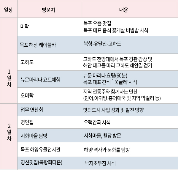 목포시에서는 그 어느 때 보다 많은 이야깃 거리가 생겨났던 2019년 맛의 도시 목포관광 분야의 주요 포인트를 직접 탐방하고, 이를 분석한 성과들을 함께 공유하며 향후 발전 방향에 대해 토론해 보기 위해 특별 자문단과 외식산업, 언론 관계자 등을 11/30~12/01 양일간 초청하였으며 이 의미있는 여정에 올 한해 목포시와 특별한 인연을 맺었던 ㈜다이어리알도 함께 동행했다.