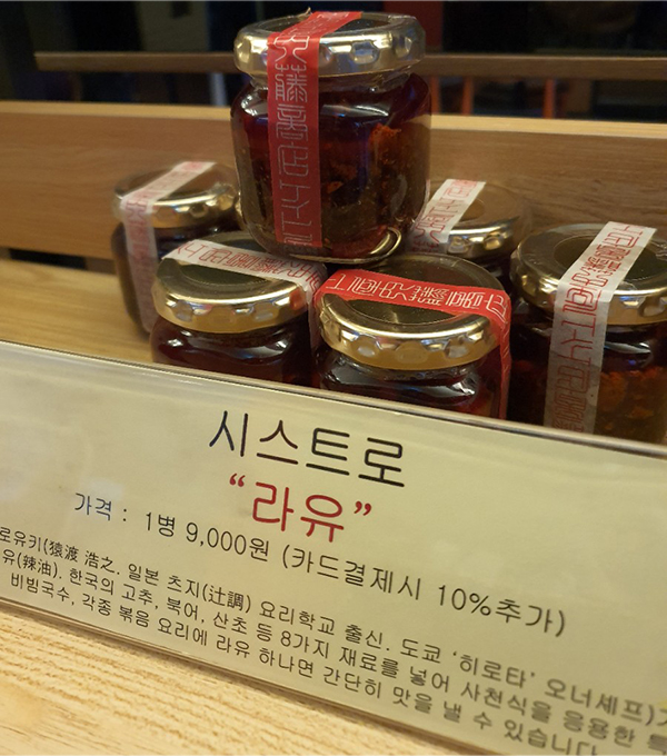 -라유비빔소바: 한국의 고추, 북어, 산초 등 8가지가 들어간 수제 라유 이용하여 야끼소바 형태로 재해석한 메뉴