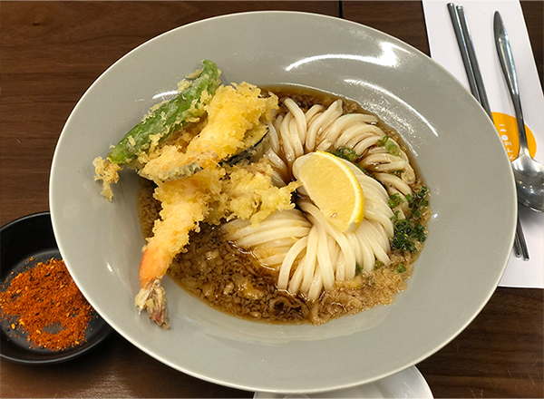 제공되는 튀김은 새우와 4가지 다른 채소의 조합으로 취향에 따라 바삭하게 즐기거나 우동 국물에 적셔 먹도록 사이드 메뉴처럼 따로 담겨 제공된다.