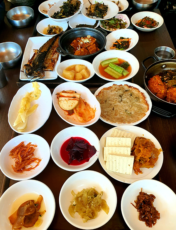 거기에 풀치 조림과 된장콩을 넣은 멸치조림이 감칠맛을 더한다. 육류는 돼지고기를 고추장에 재워 익히니 삼겹살과 제육볶음을 넘나드는 맛이다. 겨자잎이나 삶은 양배추에 싸먹으면 입에서 살살 녹는다.