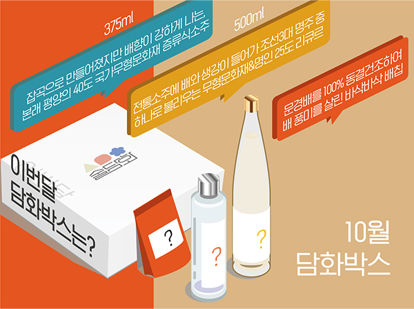 전통주 소믈리에가 전국 각지의 양조장에서 나오는 다양한 종류의 전통주를 엄선해, 곁들이기 좋은 스낵, 큐레이션 카드와 함께 선물 박스에 포장해 매달 정기 배송해준다.