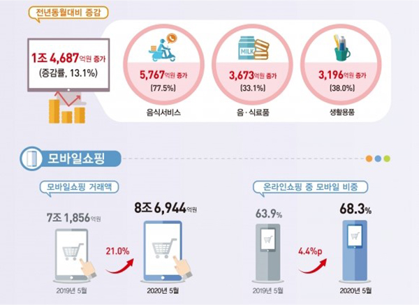 반면에 식료품 배송과 음식 배달 플랫폼의 수요는 폭발적으로 증가하는 현상을 나타냈다. 통계청 자료에 따르면 온라인 음식 배달 시장은 3년 새 6배 이상 성장했으며 특히 코로나 사태 이후 지난 4월 발표한 온라인 서비스 거래액 중 배달음식 등 음식서비스의 거래액은 83.7% 증가했다.