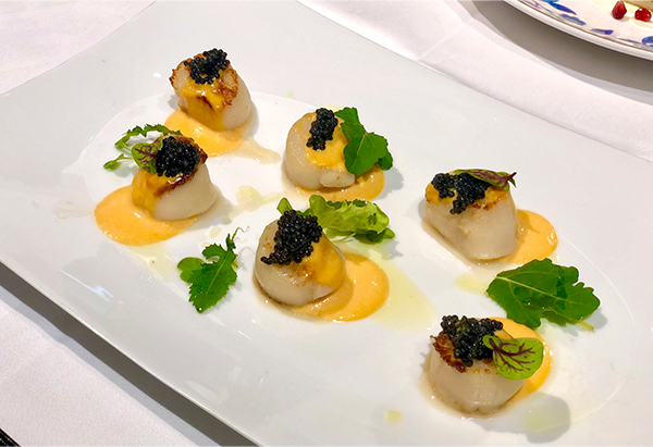 알맞게 구워낸 가리비 관자에 파프리카와 샬롯, 양파, 그리고 이탈리아 마스카포네 치즈, 엑스트라버진 올리브오일 등을 사용하여 부드러운 크림 소스를 곁들이고 화룡점정으로 이탈리아의 캐비어를 올려내는 요리다.