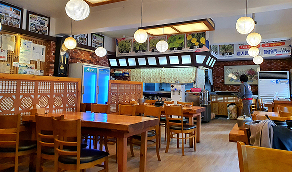 식당 앞 너른 주차공간에 차를 대면서 오대산 일대인가 하는 착각이 시작되었다. 슬라이드 문을 열면 원목 산장 같은 내부가 보이는데 안으로 발을 들이는 순간 청정 산자락으로의 공간 이동이 시작된다.