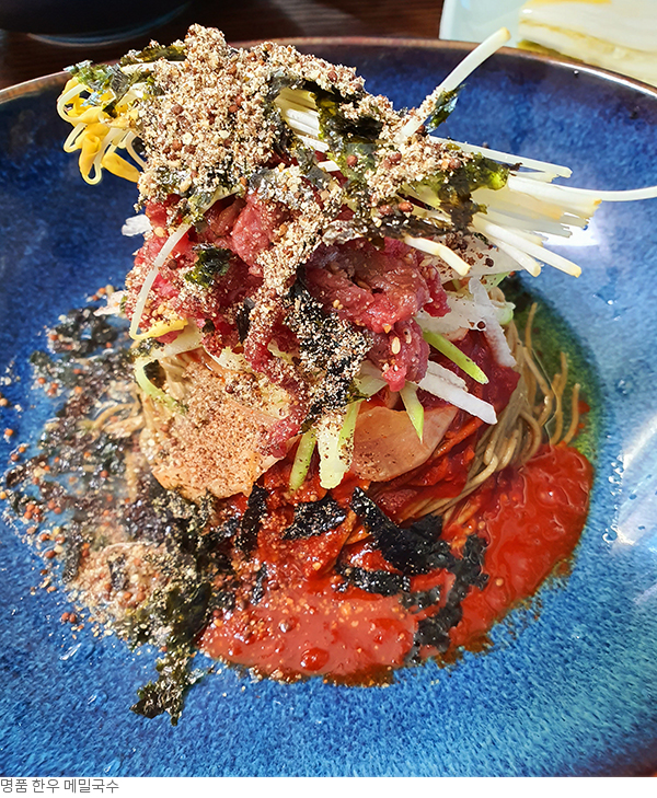 일주일에 두 번 먹으면 팔팔해진다는 뜻의 ‘이대팔 미가면’을 먹으면 막국수 본연의 맛을 그대로 느낄 수 있다. 메밀국수에 들기름, 메밀싹, 깨, 김의 간단 구성으로 메밀의 기본 맛을 제대로 경험하게 해준다. 그리고 ‘명품육회비빔국수’를 주문하면 푸짐한 육회의 양에 먼저 깜짝 놀라게 된다. 그것도 대관령한우란다. 육회와 메밀의 또 다른 조화를 알게 해주는 ‘내땅내음식’의 실현이다.