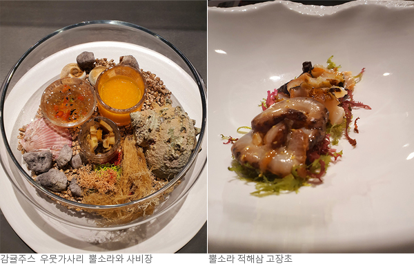 즉석에서 짠 감귤주스, 우뭇가사리, 뿔소라와사비장이 식전 입맛을 돋우고 뿔소라와 적해삼, 고장초(해초)가 전채 요리로 등장한다.