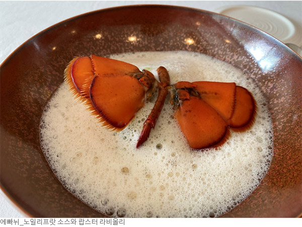 누아이 프라트(노일리 프랏) 소스의 랍스터 라비올리를 추가로 주문해 보았습니다. 와인에 다양한 향신료를 사용하여 숙성한 베르무트를 사용하여 만든 소스여서 오묘한 맛이 납니다. 꼬리 부분을 나비처럼 장식한 플레이팅이 눈길을 사로잡습니다. 탱글탱글한 랍스터와 아삭한 식감이 살아 있는 신선한 채소가 어우러져 진한 여운을 주는 요리로 좋은 샴페인이나 부르고뉴 화이트 한 잔을 곁들이면 더할 나위 없겠습니다.