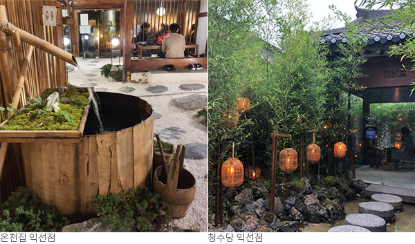 ‘온천집’은 익선동에서 가장 인기를 얻고 있는 음식점 중 하나다. 이름처럼 일본 온천 여관(료칸)을 방문한 여행자의 기분을 느낄 수 있도록 공간 콘셉트를 구성했다. 이 공간의 하이라이트인 일본식 모래정원과 온천, 화로 등 콘셉트를 완벽하게 구현하기 위해 넓은 야외 공간 전체를 과감히 할애했다.