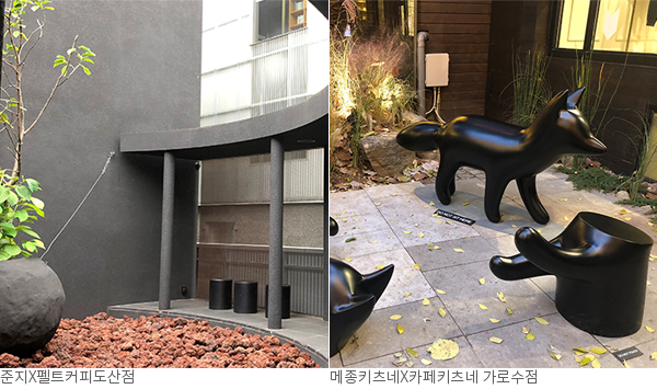 패션브랜드 ‘준지’의 서울 도산공원 플래그십 스토어에는 스페셜티 커피 브랜드 ‘펠트 커피’가 공존하며 브랜드가 갖고 있는 이미지와 디자이너의 감성에 공감하는 소비자들이 디자이너의 의류를 사지는 않더라도 경험하기 위해 이 곳을 찾는다.