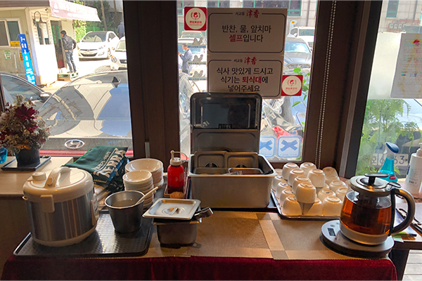 고객들은 키오스크로 원하는 음식을 주문하고 오픈 된 바에서 픽업하면 된다. 반찬, 밥, 따뜻한 차도 셀프 바에서 원하는 만큼 자유롭게 이용 가능하다.