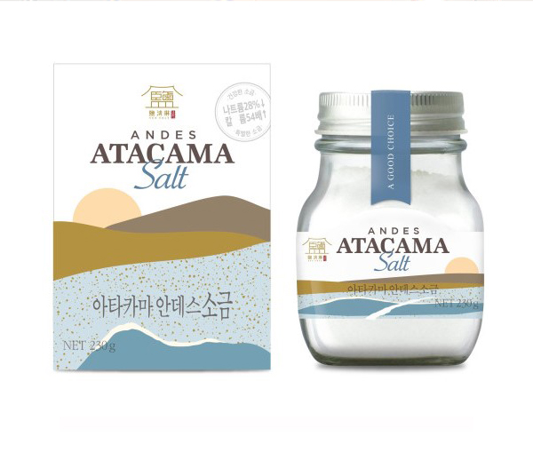 아타카마 안데스 소금은 남미 칠레 아타카마 사막 30~70미터 지하 염수층의 염수를 이용하여 생산된 짠맛이 자극적이지 않고