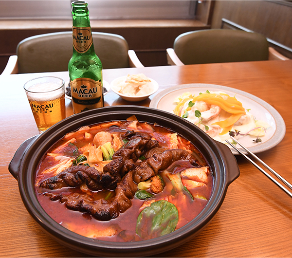 시그니처라 메뉴는 ‘마라 곱창전골’이다. 마라의 얼얼한 맛에 한국식 매운맛의 대명사인 청양고추를 더해 얼큰한 풍미를 살렸으며 화룡점정은 전골 위에 푸짐하게 얹어진 직화 곱창이다.