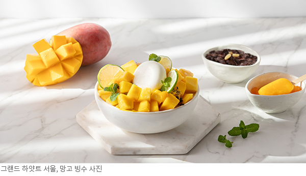 ‘전통 빙수’는 그랜드 하얏트 서울의 스페셜 밀크 아이스 위에 한국의 전통 간식인 곶감, 떡, 밤, 말린 대추, 그리고 팥을 듬뿍 올려 한국 고유의 고소함과 달콤함을 남녀노소가 부담 없이 즐길 수 있게 한다. 시그니처인 ‘망고 빙수’는 잘 익은 달콤한 생망고와 말랑하고 재미있는 식감의 우유 푸딩, 라임이 올라간 밀크 아이스에 열대과일로 만든 펄, 상큼함을 더하는 망고 셔벗 바, 그리고 팥이 별도로 제공된다.