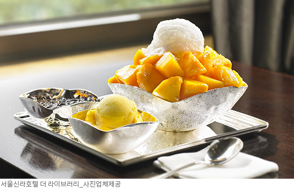 서울 신라호텔 ‘더 라이브러리’의 애플망고 빙수는 최고급 제주산 애플망고가 산처럼 쌓인 넉넉한 양과 고당도의 과즙이 골고루 퍼지는 맛, 눈길을 끄는 비주얼이 특징이다.