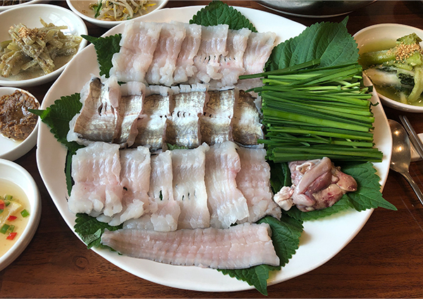 단, 육수에 담그는 시간은 3초를 넘기지 않아야 한다. 거기다 싱싱한 여름 부추와 깻잎도 육수에 살짝 데쳐 달고 아삭한 햇양파, 구수한 시골 된장까지 곁들여 푸짐한 쌈 보따리를 입안 가득 욱여넣어 씹다 보면 식재료의 감칠맛이 쉴 새 없이 뿜어져 나온다. 쫄깃하면서도 부드러운 제철 갯장어의 꽉 찬 식감을 즐기다 보면 무더위의 맹폭에도 여름을 기다릴 수밖에 없는 이유가 하나 생겨난다.