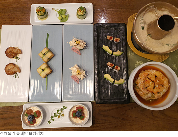 젓갈을 일체 넣지 않고 담근 보쌈김치는 정갈하면서도 시원하고, 다시마, 무, 엄나무순, 당귀 등의 채수로 끓인 들깨탕은 기분 좋은 쌉쌀함의 여운이 늘 한결같다. 이런 변함없는 전통식 이외에 창작 음식도 만들어 상차림의 조화를 이끌어낸다. 지리산에서 올라온 시금초(야생초의 일종)가 올라간 토마토 코울슬로나 오이로 감싼 열대과일모둠 등은 이름만 들어서는 한정식과 어울릴 것 같지 않으나 우아한 한정식에 모던한 터치를 더하며 상차림을 조화롭게 완성시킨다. 또한 취향의 다양성을 고려하여 온전한 채식코스는 물론 육류가 일부 포함된 자연음식코스를 갖추어 누구나 만족스러운 한 끼를 즐길 수 있도록 했다.