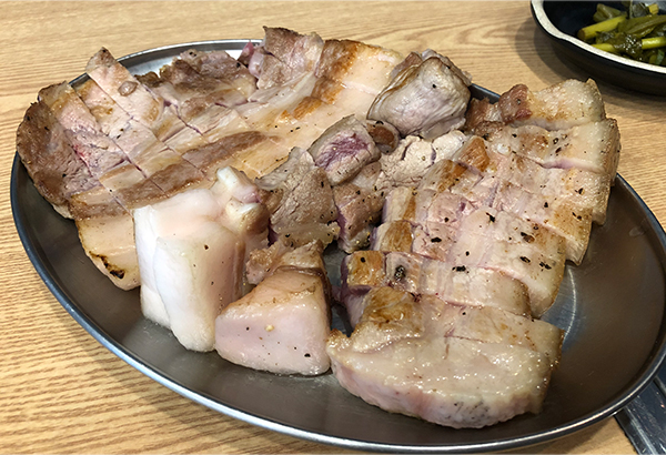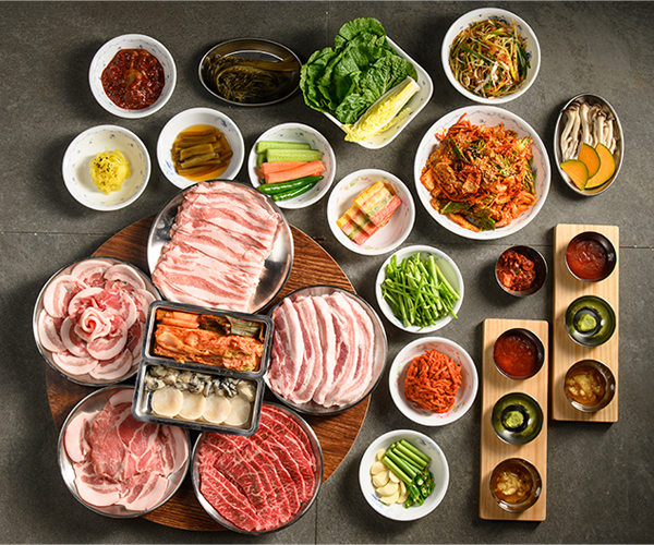고기를 주문하면 함께 식탁 위로 출전하는 선수들은 가히 위풍당당한 올림픽 대표팀의 면모 같다. 김치, 삼겹살, 관자를 의미하는 김삼관의 대표 조합과 함께 숙주, 고사리, 미나리 등 신선한 채소,구워 먹도록 고소하게 양념된 파채, 그리고 삼겹살 맛에 시너지를 더하는 어리굴젓 조합까지 음식들이 저마다 재담꾼이 되어 식사 내내 즐거운 이야깃거리를 펼쳐낸다.