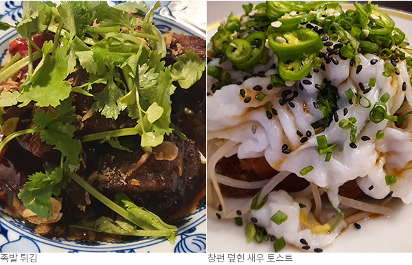 한참 유행인 멘보샤 같은 새우토스트 위에 창펀(광둥지역 쌀반죽피)이 하얗게 얹어 나오고 간장 조림한 돼지고기 목살 차슈를 팬케이크라 불리는 밀전병에 싸먹게 한다. 삭힌 고추를 잘게 다져 소복이 덮어낸 우럭술찜 요리는 생선살을 야무지게 발라 먹은 뒤에도 밥 한 공기를 뚝딱할 수 있도록 만드는 마성의 소스가 압권이다.