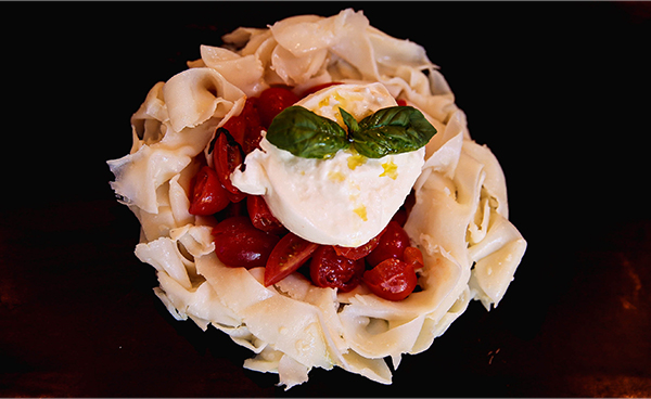 대표 메뉴인 ‘부라따 치즈를 곁들인 갑오징어 탈리아텔레’는 파스타처럼 보이지만 파스타가 아닌 전채요리(Antipasti)로 갑오징어를 수비드 처리하여 저온 숙성을 한 후 파스타 면의 한 종류인 탈리아텔레 면처럼 얇게 썰어 방울토마토와 부라따 치즈를 같이 곁들여 먹는 메뉴다.