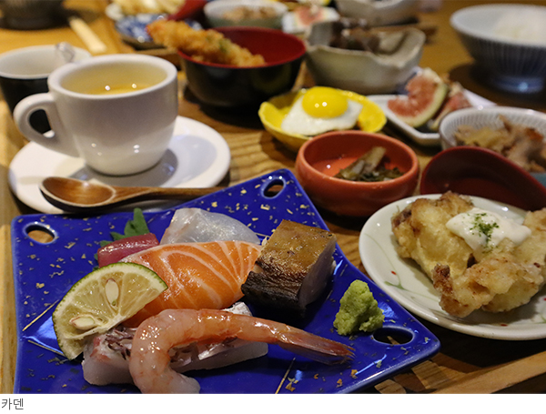 신선한 제철 재료로 섬세하게 만들어낸 요리와 술을 함께 즐기기 좋으며 점심시간에만 운영하는 ‘카덴 정식’은 다양한 일식 요리가 정갈한 담음새로 반상에 담겨 나와 인기가 높다.