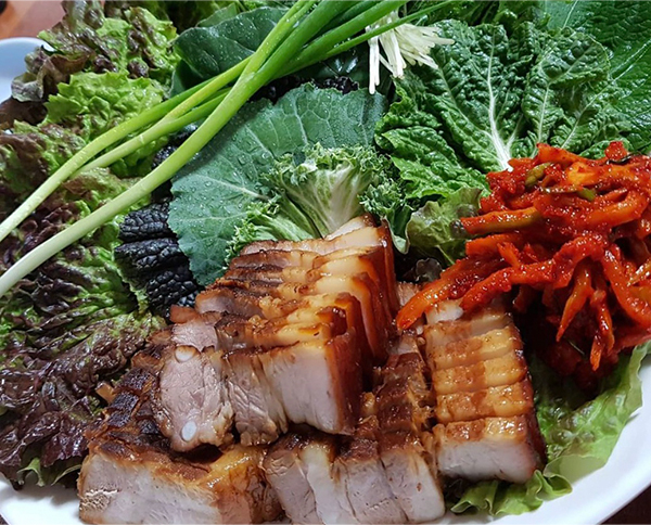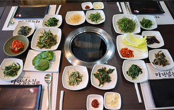 고기를 보다 건강하게 즐길 수 있는 방법, 기름진 고기를 먹고 나서도 속이 편할 수 있는 식사에 대해 고민하던 주인장은 나물에서 그 해답을 찾았다. 고기가 상에 오르기도 전에 이곳의 식탁에는 그 계절의 초록색 선물들이 한상 가득 펼쳐져 있다. 특히 나물의 생동기인 봄철에는 향긋한 나물 페스티벌이 자체 개막된다.