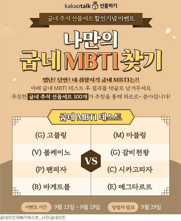‘굽네치킨’에서는 공식 SNS를 통해 ‘굽네MBTI테스트’를 소개하며 개인별 치킨, 피자 취향에 따라 MBTI를 소개하며 메뉴를 추천해주는 콘텐츠를 선보였다. ‘MBTI테스트’는 성격유형을 측정하는 검사로 사람의 성향을 16가지 유형으로 분류하는데 이는 ‘MZ세대의 명함’으로 불리운다.