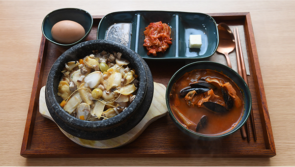 대표 메뉴인 ‘전복 영양 돌솥밥’은 1인분에 신선한 완도 전복 2-3미가 아낌없이 사용된다. 전복의 내장을 뜻하는 제주 방언인 ‘게우밥’에서 영감을 받아 바다의 향이 가득한 내장과 함께 밥을 짓고 부드럽게 익힌 전복의 살은 먹기 좋게 슬라이스하여 밥 위에 올려낸다.