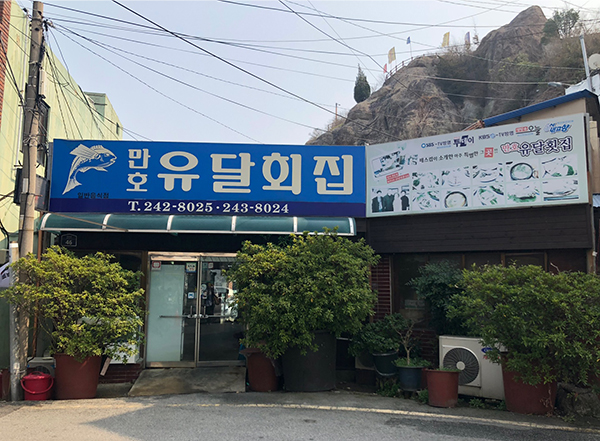 ‘만호유달횟집’은 민어의 거리에서 가장 먼저 손꼽히는 전통 있는 가게로 햇수로 50년 세월을 목전에 두고 있다. 오랜 세월 목포 시민들과 목포를 방문한 관광객들에게 한결같은 민어 맛을 선보이는 곳이다. 목포를 대표하는 민어 집답게 여름철 성수기에는 눈코 뜰 새 없이 바쁘게 돌아가는 곳으로 봄, 가을철에는 인근 영암과 무안에서 골프를 즐긴 후 굳이 목포에 들러 민어를 즐기고 가는 골퍼들도 많이 찾는 곳이다