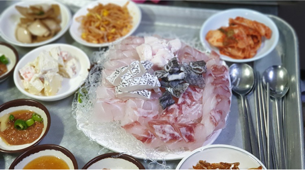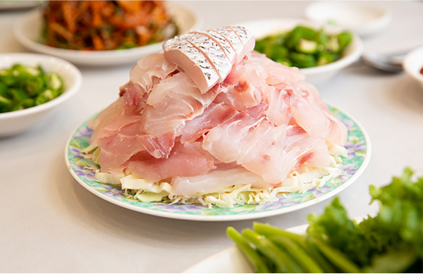 이곳의 민어는 크기가 큰 것만을 쓰며 충분히 숙성시켜 갓 썰어낸 ‘민어회’의 살은 특유의 부드러운 식감과 고소한 맛이 일품이다. 깻잎에 밥과 싱싱한 회, 마늘, 김치, 쌈장을 한데 올려 먹는 것이 목포식 쌈이라고 하니 한번 시도해 보자. 민어를 제대로 맛보기 위해서는 ‘특수부위’를 빼놓을 수 없다.