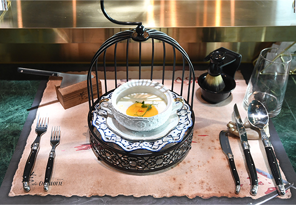 아름다운 수프 그릇을 새장 속에 담아 제공하는 ‘샤프란 골드 수프’는 감시하에 갇혀사는 인물인 조안나의 처지를 새장에 비유한 것으로 분자 요리 기법이 활용된 특별한 디시로 단호박과 부드러운 크림이 만나 밸런스가 훌륭한 맛을 선사하며 화사한 금빛은 머릿결을, 귀한 사랑의 마음을 표현하기 위해 귀중한 식재료인 샤프란이 방점을 찍는다.