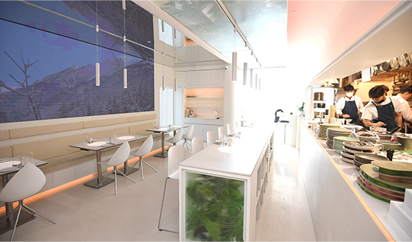 시그니처 메뉴인 ‘한입요기’는 계절을 가장 잘 드러내는 메뉴 중 하나다. 첫번째 테마로 선보인 ‘겨울한입요기’ 디시는 겨울 산에서 받은 영감을 한입 거리 타파스로 풀어냈다. 눈 덮인 겨울의 나무가 심어진 접시와 제공될 때 함께 등장하는 로즈마리향을 머금은 드라이아이스의 극적인 연출은 식사의 즐거움과 ‘인증의 욕구’를 동시에 만족시킨다.