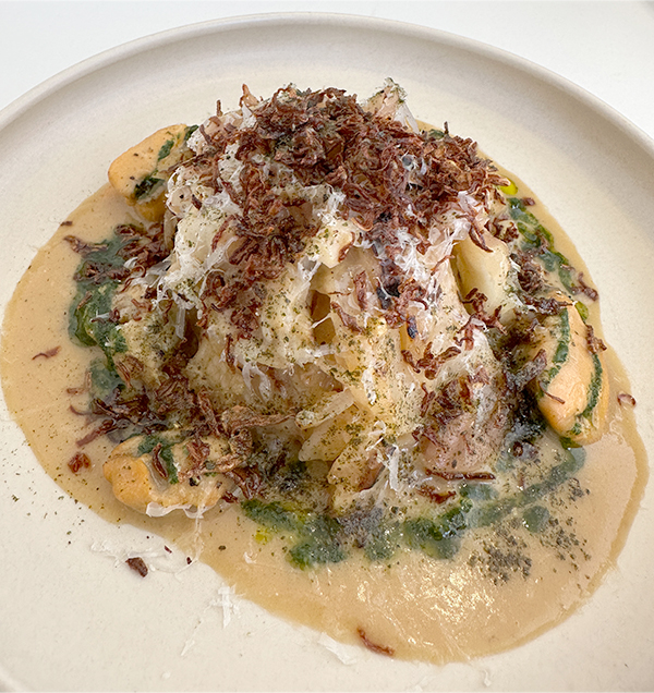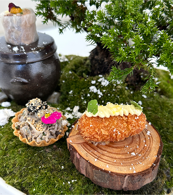 검은콩 소스와 동결 건조하여 초록 고추장에 비빈 오징어 초회를 바삭한 타르트지에 올려낸 오징어 초회와 참새우와 고춧가루를 사용하지 않은 김치를 주재료로 만든 고로케까지 각각의 한입을 통해 식감과 온도가 연결되며 한 장의 겨울 풍경을 완성시킨다.