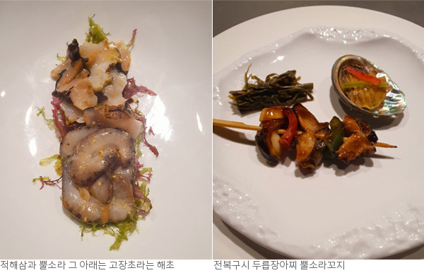육지의 소라와 다르게 제주 현무암에 박혀있다 보니 뿔이 많이 생긴 뿔소라. 뿔소라를 일반 수조에 담가두면 뿔이 점점 없어져 육지의 소라처럼 된다고 하니, 강인하게 거센 자연에 맞서 견뎌온 세월의 증거를 제 몸에 두른 소라는 제주 바다에서 생존하는 해녀의 강건함과 비유되곤 한다. 해녀의 현지 밥상이라 해서 소박한 어촌계 시골밥상 정도를 상상했는데, 나오는 차림새가 꽤 세련되었다.