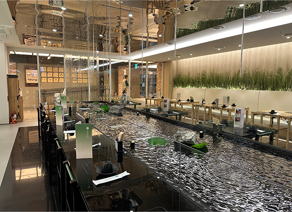 ‘자연이 곧 일상이 되는 정원’을 모토로 잔잔한 물과 바위 그리고 식물까지 자연의 물성이 어우러진 입구의 오아시스가 매장 내부의 꽤 많은 부분을 차지하고 있으며 폭포처럼 떨어지는 물과 만난 잔잔한 연못은 고객들이 식사하는 바 테이블과 오버랩되어 식사를 하는 내내 오감이 자연의 요소와 편안하게 동화될 수 있도록 했다.