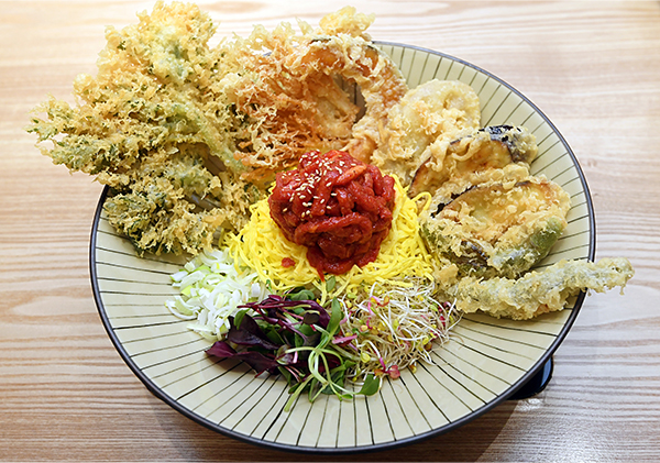 한식 메뉴로 친숙한 한우 육회와 일식 일품 메뉴인 텐동을 결합한 ‘한우육회텐동’은 다른 곳에서는 맛볼 수 없는 특색 있는 한 그릇이다. 바삭하게 튀긴 쑥갓, 팽이버섯, 연근, 꽈리고추 등 덴뿌라가 꽃잎처럼 풍성함을 더하며 한우 홍두깨 부위를 특제 고추장 소스로 맛을 낸 육회가 방점을 찍는다.