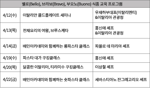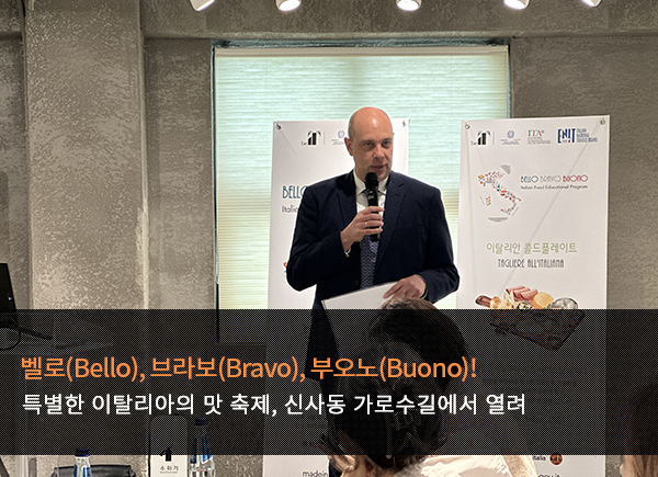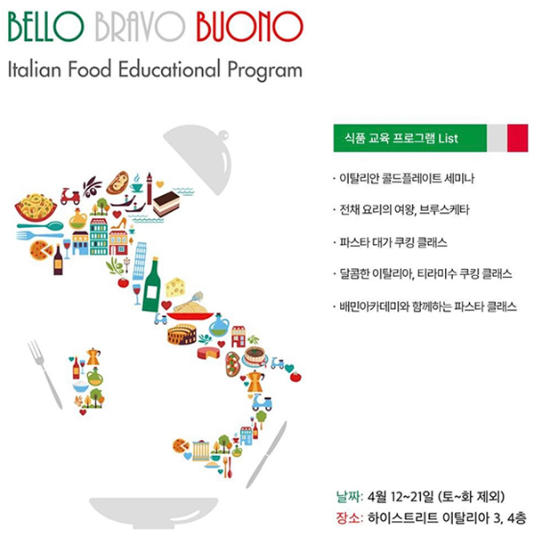 이탈리아 무역공사(ITA)는 4월 12일(수)부터 21일(금)까지 자체 홍보관인 하이스트리트 이탈리아에서 아름답고 훌륭하면서 맛있는, 이탈리아어로 “벨로(Bello), 브라보(Bravo), 부오노(Buono)!“라는 감탄사를 주제로 깊은 역사와 지역별 특색, 그리고 장인 정신이 깃든 이탈리아의 음식을 주제로 4월 2주간 특별한 식문화 이벤트를 개최했다.