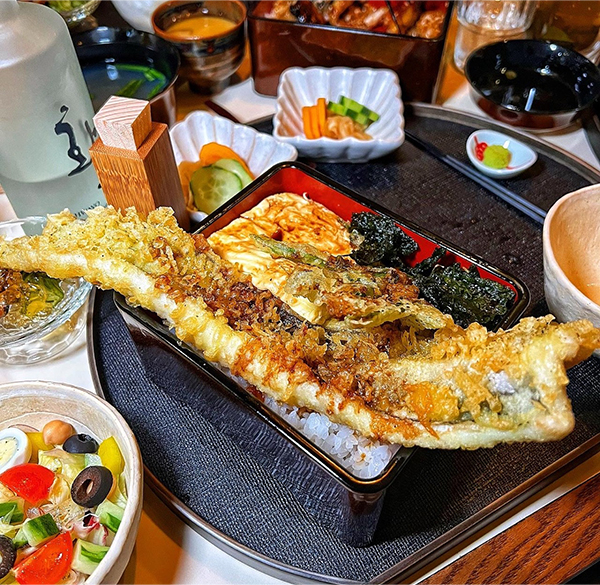 세트를 주문하면 샐러드와 해산물, 민물장어 초회, 민물장어 달걀찜 등 다양한 장어 요리를 맛볼 수 있다. 바다장어를 통으로 튀겨 올린 아나고 텐쥬도 이곳의 특색 메뉴다.