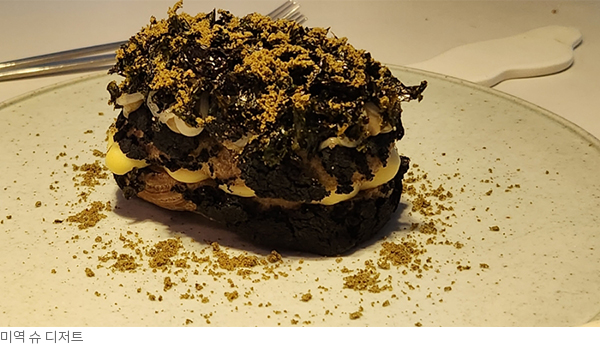 이런 방식의 음식이 전혀 억지스럽지 않고 오히려 매일 먹는 나의 한식 밥상을 돌아다보게 한다. 심지어 디저트로 튀긴 미역이 소복이 얹어진 슈크림 빵이 나온다. 생일국에서 보는 친숙한 미역은 한국인에게 삶의 친구 같은 식재료인데, 그 미역이 오늘은 달콤한 입가심이 되었다.
