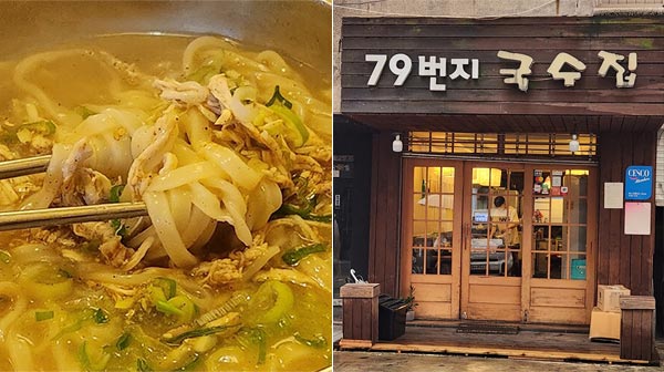‘79번지국수집’은 경희대 인근의 인기 국숫집. 여러 국수와 전류 모두 가성비가 좋다. 닭칼국수의 걸쭉한 국물이 매력적이다. 닭살이 풍성히 올라가진 않지만 국물과의 조화가 환상이다.