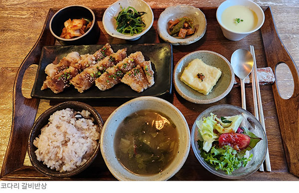 손잡이가 있는 나무 사각 쟁반에 달걀찜, 샐러드, 나물, 두부 부침, 김치 등에 잡곡밥, 국 그리고 코다리 갈비구이가 나온다. 연한 간장 양념이 슴슴하게 밴 가시를 뺀 코다리를 기름에 지져 고소함이 넘쳐난다. 국은 어릴 적 맛봤던 시골된장국 맛이다. 달걀찜은 세상 부드럽다. 혼신의 힘을 다하는 오너가 쟁반 한식을 차린다.