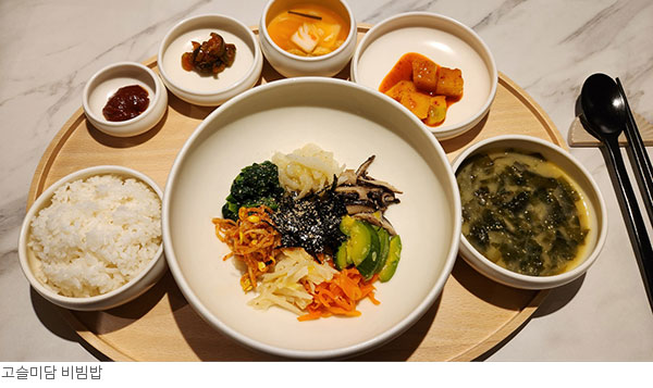 둥근 쟁반에 백색 자기의 비빔 대접과 밥, 물김치, 깍두기 등 필요한 반찬만 담았다. 소박하지만 제대로 밥 한 끼를 대접받는 기분을 느낄 수 있으며 홀로 외식에도 제격이다.