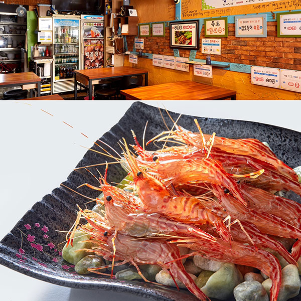 특히 ’독도 꽃새우‘로는 일대에서 첫손에 꼽히는 곳이다. 소박한 외관의 가게 앞 어항은 매일 100% 산지 직송으로 전달된 바다의 생동감이 그득한 보물창고다. 꽃새우는 울진 죽변항에서 매일 직송되는 자연산으로 대다수 고객이 꽃새우가 포함된 메뉴를 선택한다.