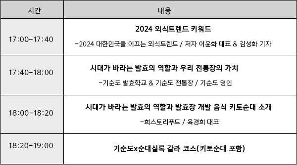이어서 기순도 명인이 전하는 발효의 의미를 듣고 최근 일본 진출을 알린 희스토리 푸드 육경희 대표의 순대의 글로벌 진출에 대한 활동을 전파하는 3개의 세션이 마련됐으며 2024 대한민국을 이끄는 외식트렌드 서적과 기순도 전통장, 희스토리푸드의 다양한 상품들을 접하고 구매할 수 있는 기회도 마련됐다.